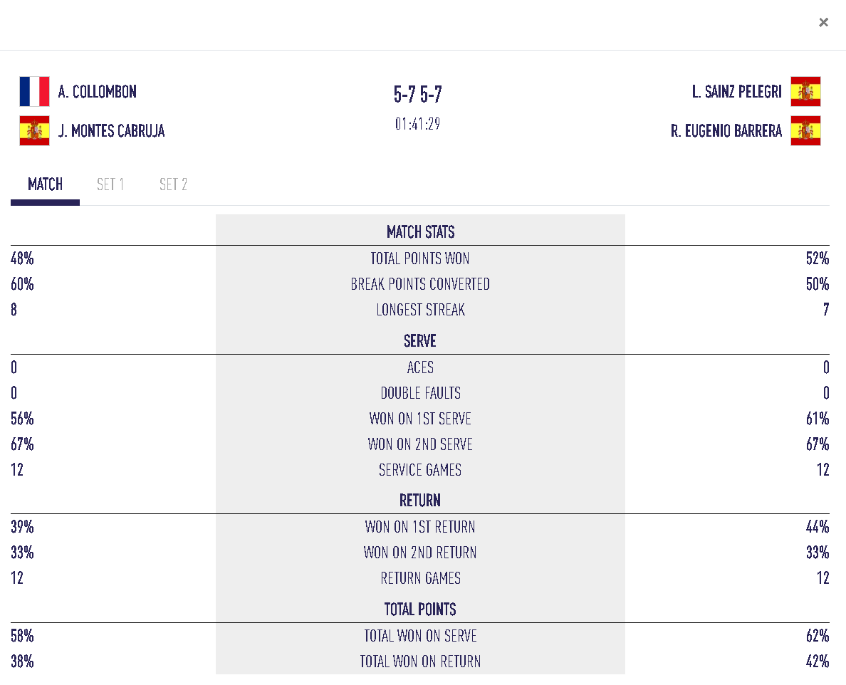 Les estadístiques confirmen aquesta impressió: 48% dels punts guanyats per Collombon / Montes Cabruja contra el 52% pels seus rivals, un percentatge de primers serveis proper (56% contra 61%), i una eficàcia equivalent al segon servei (67%).