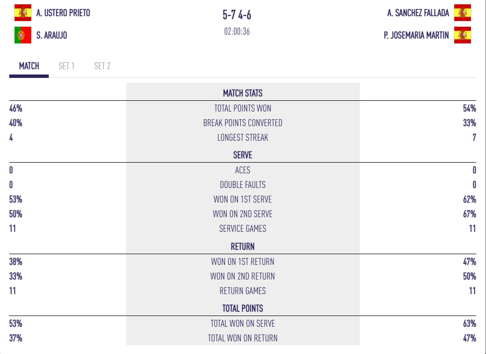Els números reflecteixen aquesta superioritat en els moments importants: 50 punts guanyadors per a Josemaría / Sánchez, en comparació amb 38 per a Araújo / Ustero. Amb 34 faltes directes (contra 37), signen un partit sòlid i equilibrat, prova d’un retorn de domini que els mancava les darreres setmanes.