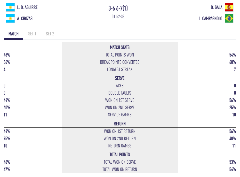 Davant una parella sòlida, en confiança, Aguirre i Chozas van patir en el primer set. Més agressius i més realistes, Campagnolo i Gala van aconseguir convertir 60 % de les seves oportunitats de break, mentre que només 36 % per als seus rivals. En el segon set, Tolito i Alex van mostrar una reacció d’orgull, aconseguint trencar el servei quan perdien 5/3. Però en el tie-break, la parella argentina no va poder resistir, caient clarament per 7/1.