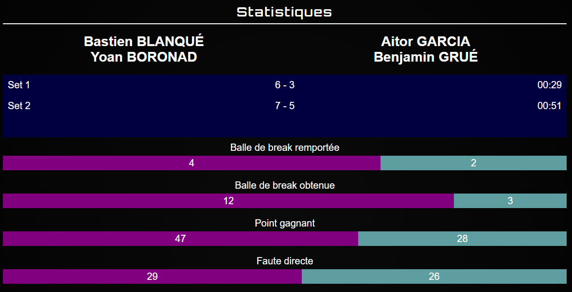 Estatísticament, la dominació és clara: 47 punts guanyadors a 28 per Blanqué i Boronad, més incisius i constants en el joc. Per a un primer torneig junts, aconsegueixen un títol de prestigi i confirmen la seva bona complementarietat.