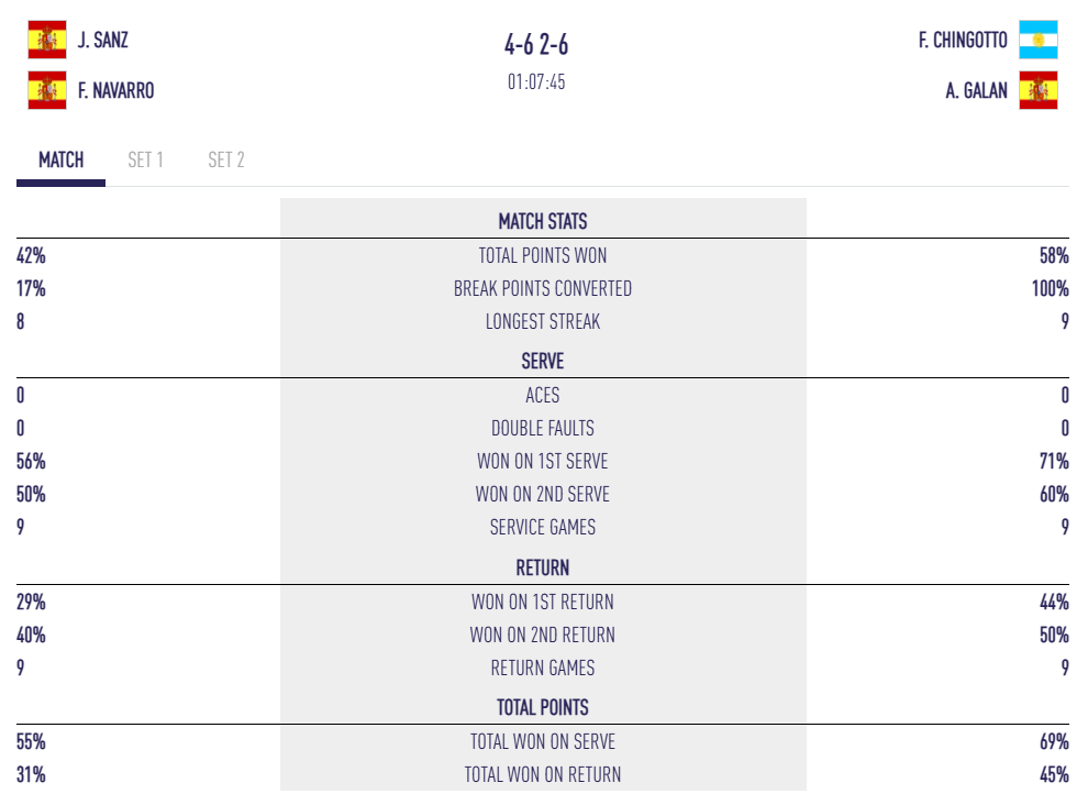 El resultat final, 6/4 6/2, demostra la superioritat dels números 2, amb un partit gairebé perfecte: 100% d’èxit en els punts de break (4/4), 58% dels punts guanyats i només 6 errors directes en comparació amb els 11 dels seus rivals.