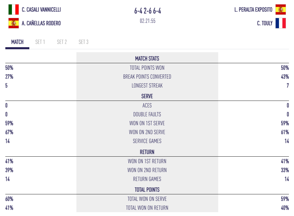 Però en el tercer set, tot es va jugar en alguns detalls. Casali i Cañellas, més sòlides en els moments clau, van aconseguir convertir les oportunitats que se’ls presentaven. Com mostren les estadístiques, van concretar el 17 % dels seus punts de trencament, en comparació amb cap per al duo franco-espanyol en la darrera mànega.