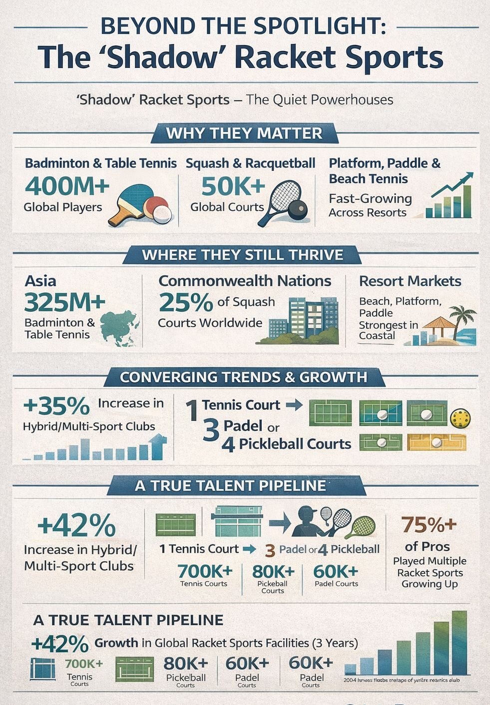 Mentre el padel, el pickleball i el tennis concentren l’atenció mediàtica, una realitat més profunda estructura el mercat mundial dels esports de raqueta. En segon terme, disciplines menys visibles — bàdminton, tennis de taula, squash, racquetball, beach tennis, platform tennis o real tennis — configuren, però, la participació, la formació dels jugadors, l’economia dels clubs i els models d’infraestructures.