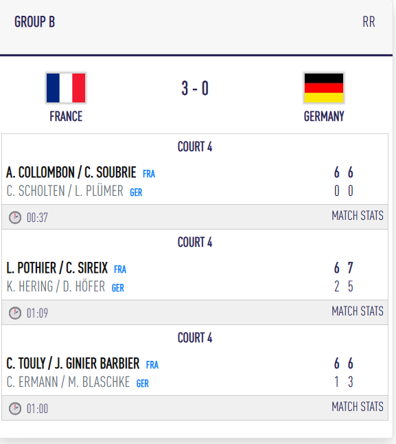Per a aquest segon enfrontament, l’equip tècnic francès va decidir fer rotacions, deixant Léa Godallier i Louise Bahurel al descans. La aposta va ser encertada: Alix Collombon i Charlotte Soubrié han obert el camí amb una victòria contundent (6/0 6/0) davant de Scholten / Plümer. Tot seguit, Lucile Pothier i Camille Sireix han demostrat mestria i sang fred per imposar-se 6/2 7/5 contra Hering / Höfer. Finalment, Carla Touly i Jessica Ginier-Barbier han tancat el dia amb seriositat (6/1 6/3) davant de Ermann / Blaschke.