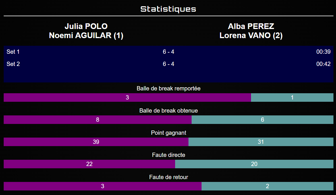 Malgrat que el marcador es manté ajustat, Polo i Aguilar han fet la diferència en els moments importants. Més agressives a l’hora de la xarxa i més sòlides mentalment, han sabut aprofitar 3 de les seves 8 oportunitats de break, enfront de només 1 de 6 per part de les seves rivals. La seva constància en els intercanvis ha marcat la diferència, especialment en les etapes finals del partit.