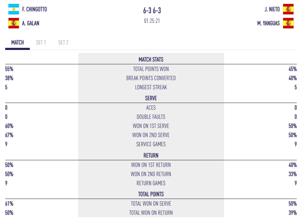Els números parlen per si mateixos: 23 punts guanyants per a Galán / Chingotto contra 12 només pels seus rivals en aquest primer set, guanyat 6/3.