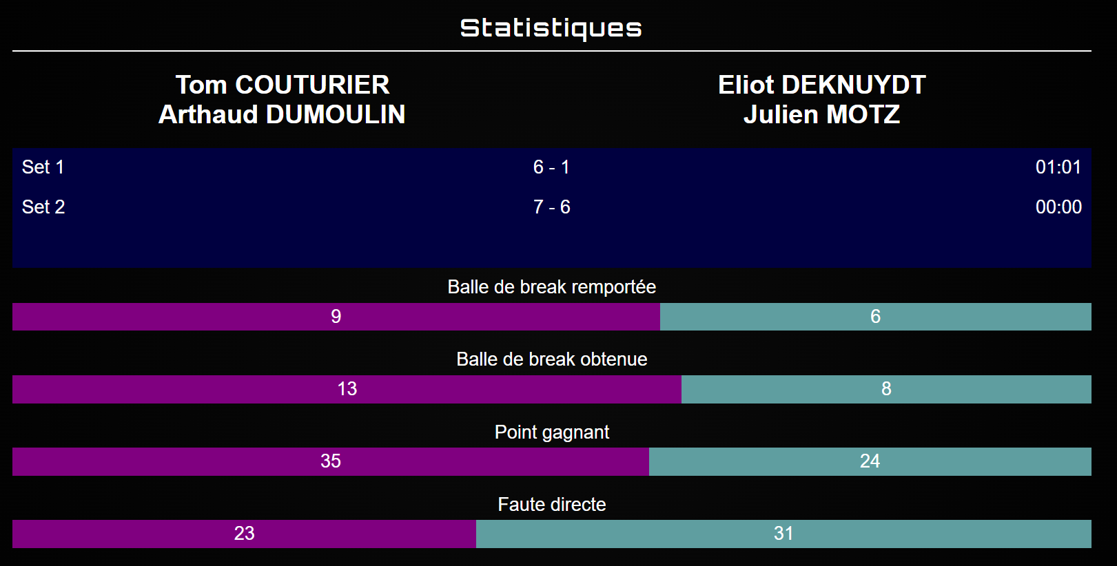 Victòria 6/1 7/6 en 1h01, amb unes estadístiques que confirmen la superioritat de Couturier / Dumoulin (més punts guanyats, millor eficàcia en els punts de break).