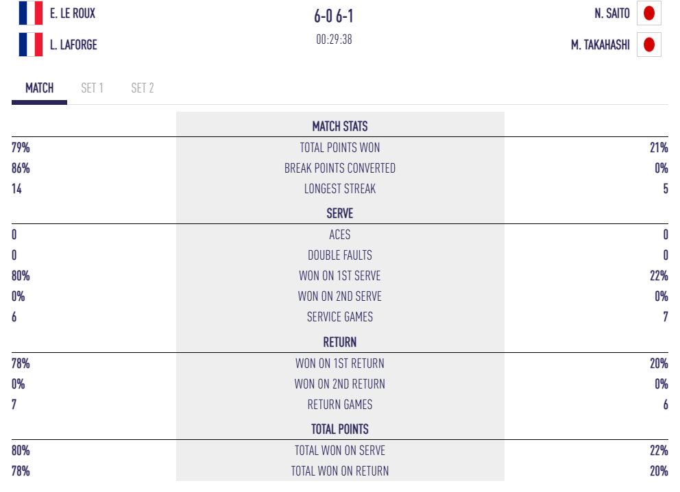 • Élise Le Roux / Lylwenn Laforge guanyen Nazuna Saito / Mako Takahashi : 6/0 6/1.