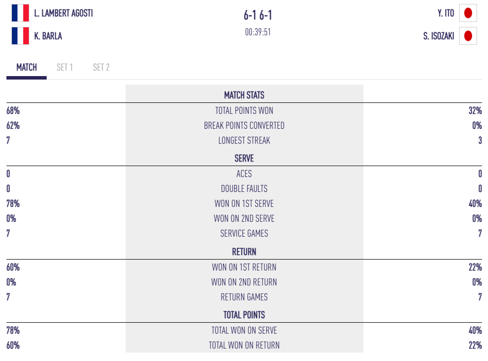 • Lou Lambert-Agosti (FIP 555) / Kimy Barla (FIP 472) dominen Yume Ito / Seira Isozaki : 6/1 6/1.