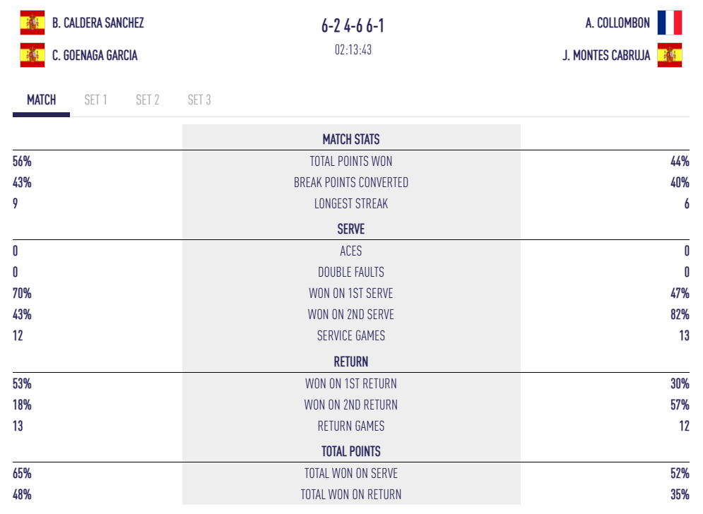 El segon set comença amb la mateixa tendència, però amb 4/3 i un trencament d’avantatge per a les favorites, la parella franco-espanyola incrementa el ritme. Montes, més contundent a nivell ofensiu, i Collombon, fidel al seu rol de metrònom a la dreta, inverteixen la dinàmica. Incomodada, Goenaga comet errors directes, permetent als seus rivals recuperar el trencament en el millor moment.