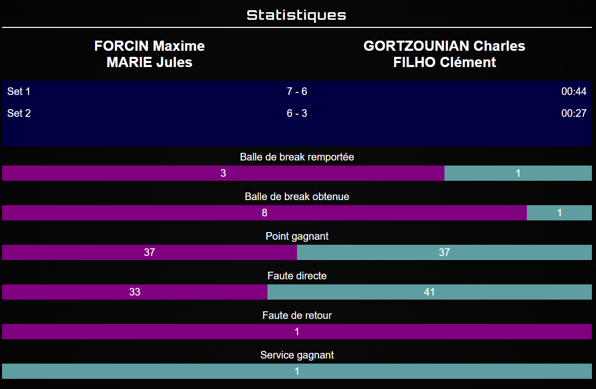 El primer set, molt disputat, s’ha jugat en un tie-break guanyat per poc per la parella Marie / Forcin, abans que despleguessin el seu joc al segon. Maxime Forcin, impressionant de regularitat, ha recolzat perfectament a Jules Marie, qui aquest diumenge buscarà un primer títol en P1000.