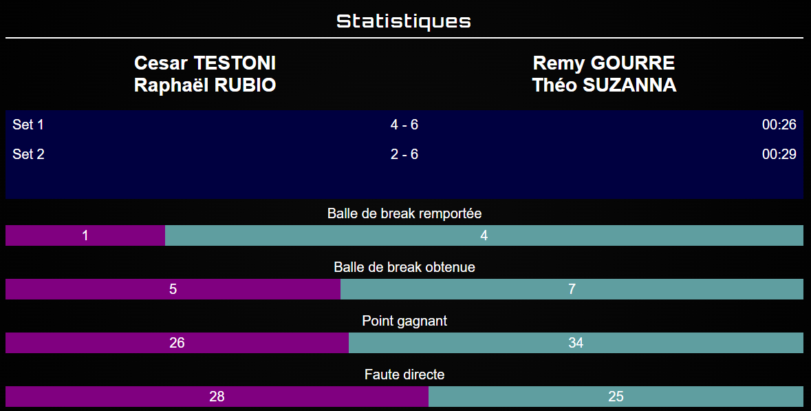 Molt aviat, Rémi Gourre imposa la seva llei a la diagonal esquerra, fent retrocedir César Testoni, cada cop més tens i frustrat. Més precís, més constant, més agressiu en la presa de pilota, Gourre inclina la mànega a favor del seu duo, que guanya lògicament el primer set 6/4.