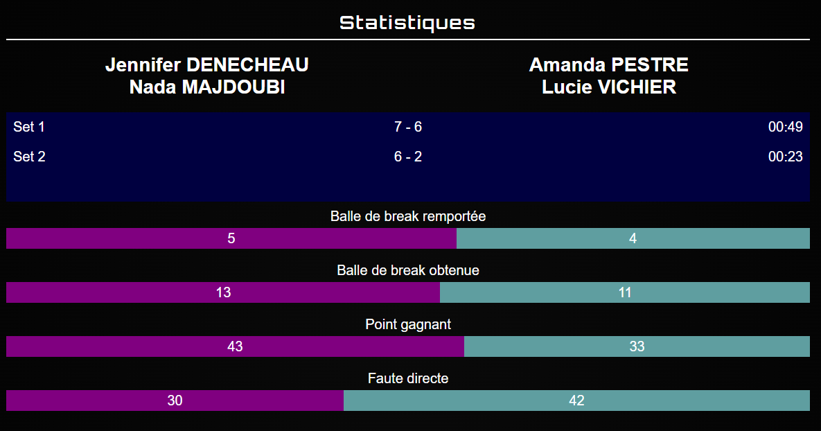 Les estadístiques confirmen la dominació de Denécheau i Majdoubi: 43 punts guanyats en front de 33 per a les seves adversàries, i sobretot 30 errors directes en comparació amb 42 per a la parella Pestre / Vichier.