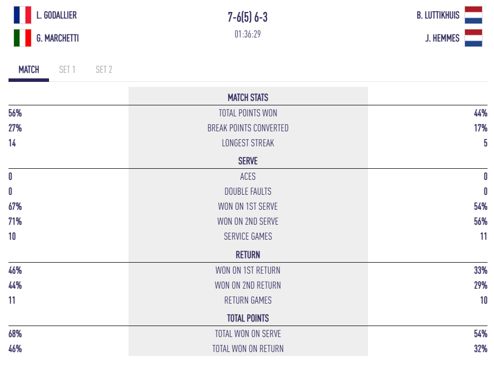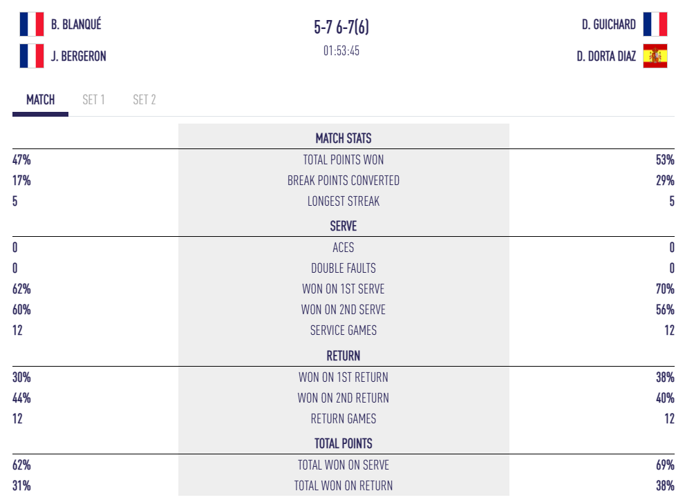 Les estadístiques confirmen la intensitat: 53 % dels punts guanyats per Guichard / Dorta contra el 47 % per a Blanqué / Bergeron, i una millor eficàcia en les ocasions de break (29 % contra el 17 %). Guichard confirma així la seva dinàmica, ell que acaba de guanyar un títol de campió de França davant… Blanqué.