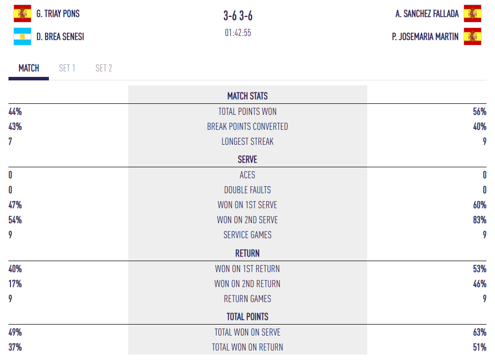 Les dades parlen per si soles: 51 cops guanyadors, 21 smashes i només 18 errors directes. Josemaría és arreu, aclaparant a la xarxa, mentre que Sánchez ofereix una actuació exemplar de precisió i constància. Al contrari, Triay i Brea, lluny de ser dolentes, simplement no han trobat la clau davant d’un duo en total confiança.