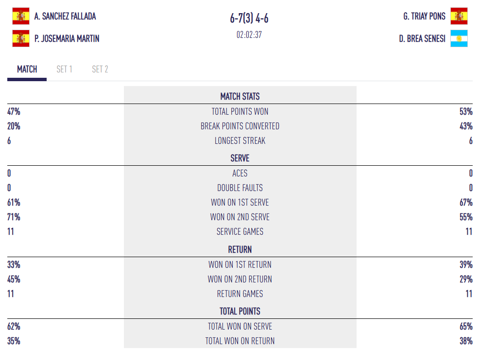 L’inici del partit es decanta a favor de Sánchez i Josemaría, en forma, aprofiten una intensitat menor de Delfi Brea per tenir tres pilotes de break a 3/2, i després una oportunitat de set a 5/4. Però en cada ocasió, no aconsegueixen convertir. La tensió augmenta quan un fet de joc anima Triay i Brea: un error d’aparença de l’àrbitre en un servei que era vàlid molesta Ariana Sánchez, impedint-los de tancar.
