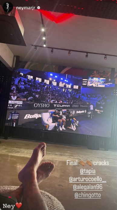 Estirat davant d’una immensa pantalla, el brasiler va saludar els quatre protagonistes del cartell: Tapia, Coello, Chingotto i Galán, amb un missatge senzill però eloqüent: “Final cracks”. Una publicació que no va passar desapercebuda, sobretot quan sabem que el seu compte d’Instagram reuneix més de 230 milions de seguidors.