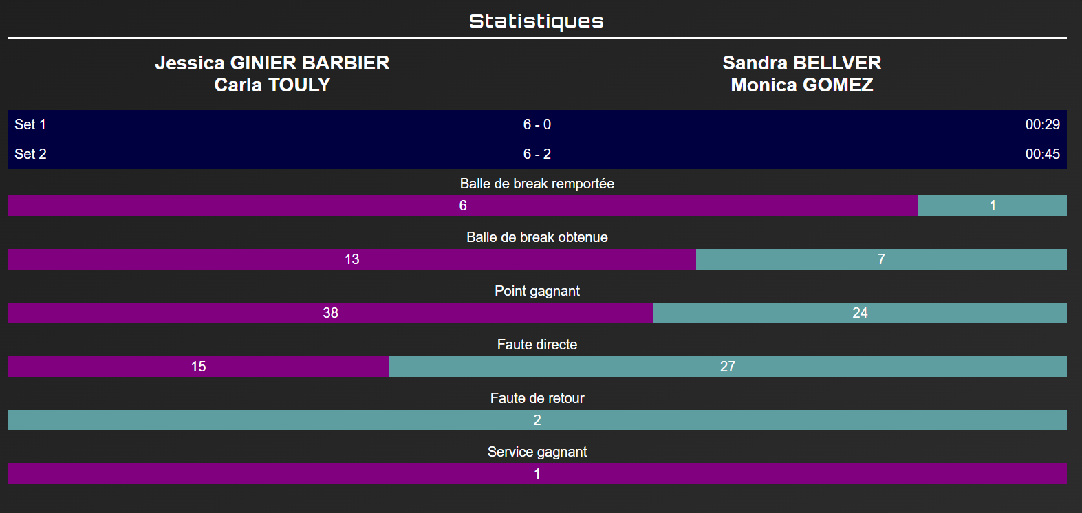 En el segon set, la resistència s’ha intensificat a l’altra banda, però Touly i Ginier han continuat dictant el tempo, guanyant tots els punts importants. Han sabut convertir 6 de les seves 13 pilotes de break, contra només 1 de 7 per les seves adversàries.