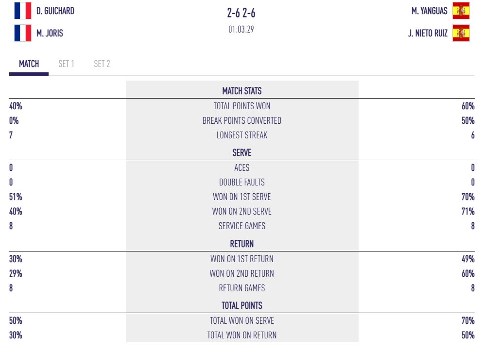Tot i això, Maxime Joris i Dylan Guichard no han deixat de lluitar. Alguns cops d’efecte, especialment en el smash, han despertat les graderies de la Patinoire de Mériadeck. Però davant de la rigidesa tàctica i la precisió dels espanyols, cada petita errada es pagava cara. Les estadístiques són clares: 40% de punts guanyats pels francesos contra 60% pels seus adversaris, i 0 pilotes de break convertides.