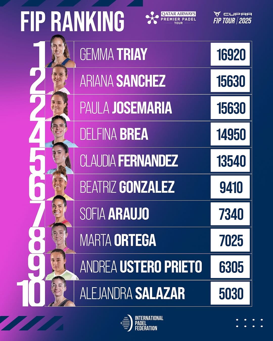 Triay conserva el primer lloc individual amb 16920 punts. Brea (14950 pts) es manté en quarta posició, mentre que Ari i Paula ocupen la segona i tercera plaça (15630 pts cada una), però en pes de parella són Triay i Brea qui van al davant, convertint-se així en les noves reines del pàdel mundial.
