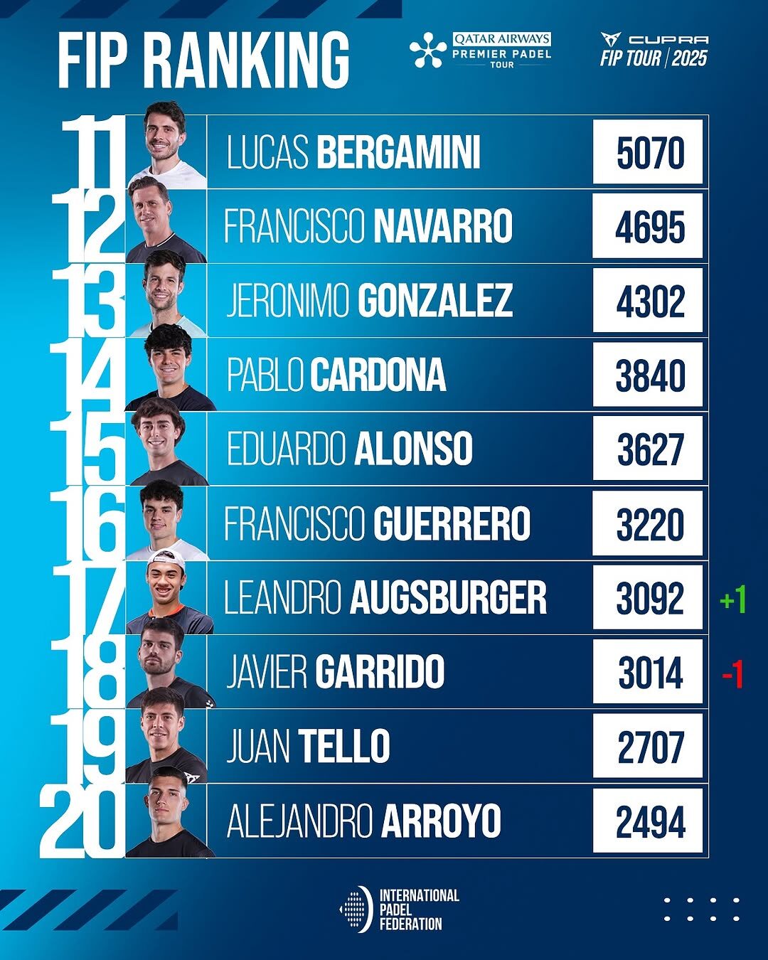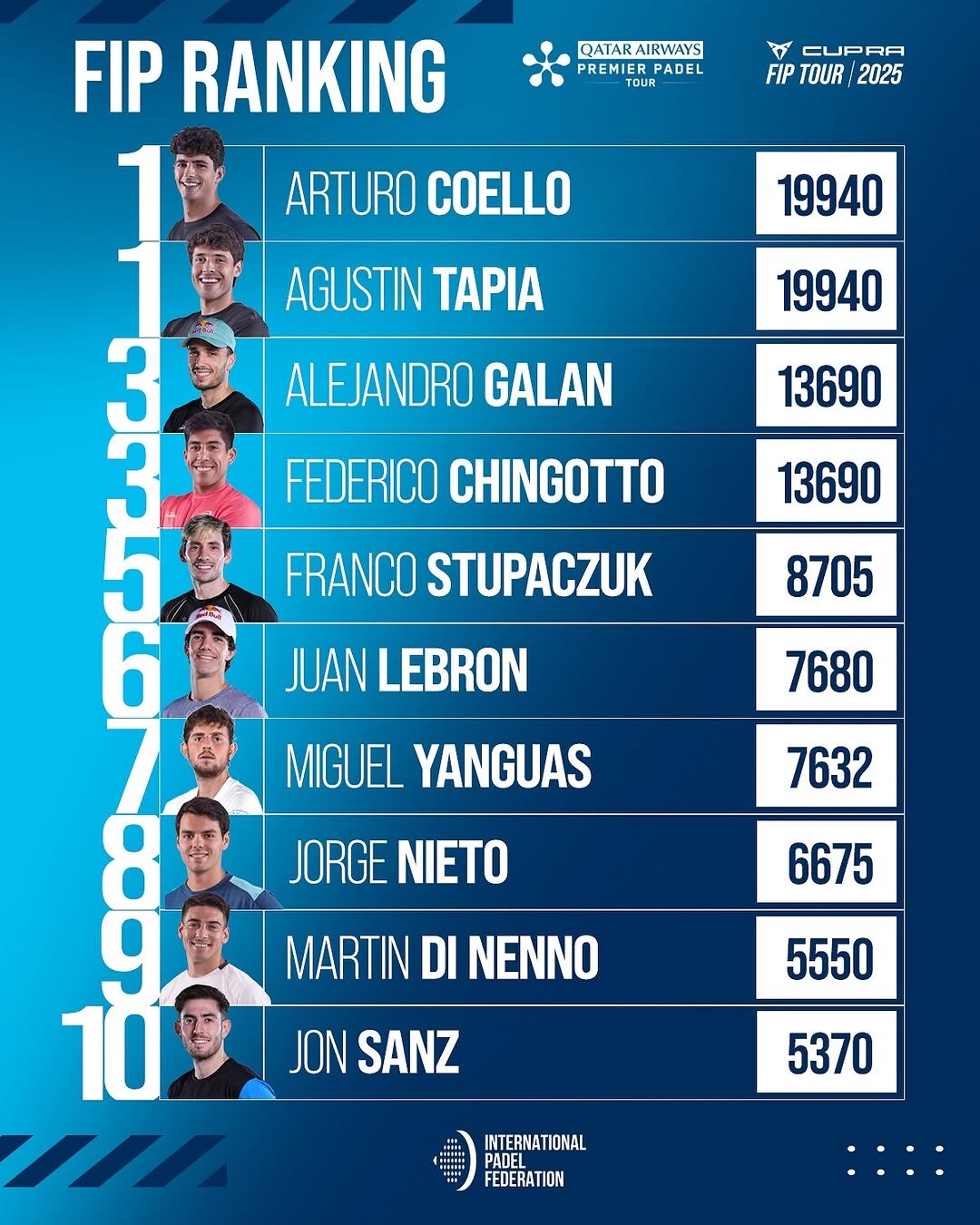 Guanyadors a Tarragona davant dels seus principals rivals Galán i Chingotto, Agustín Tapia i Arturo Coello prenen encara més distància al capdavant de la classificació. Els dos homes compten ara amb 19940 punts, és a dir, més de 6000 unitats d’avantatge sobre els seus perseguidors directes.