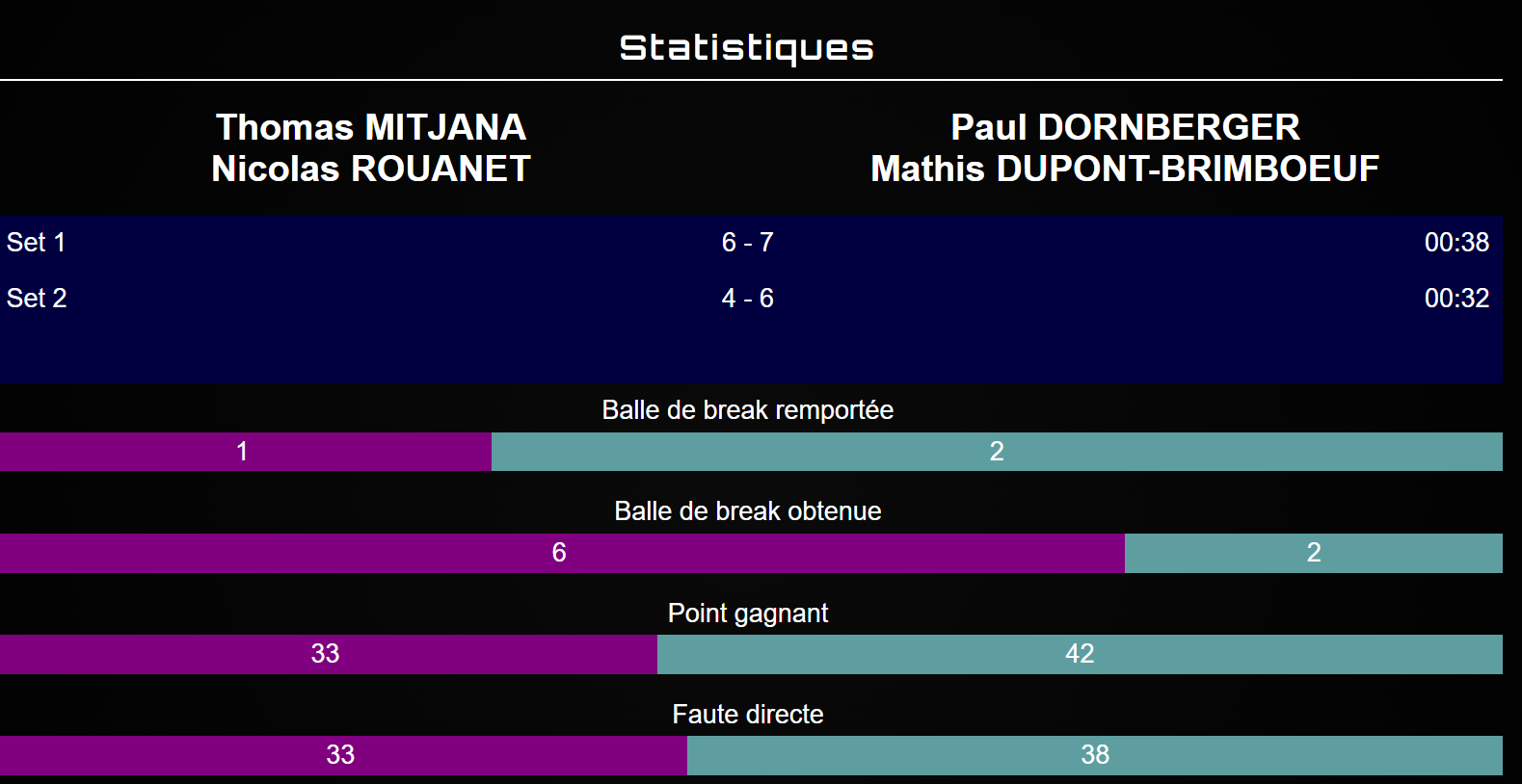Pel que fa als favorits, Nicolas Rouanet manté el seu rang, però Thomas Mitjana es mostra més en dificultats, sobretot en l’impacte ofensiu. Davant d’una parella tan sòlida i consistent, això acaba pesant. Dornberger i Dupont-Brimbeuf imposen el seu ritme, dominen l’intercanvi i tanquen la final 6/4.