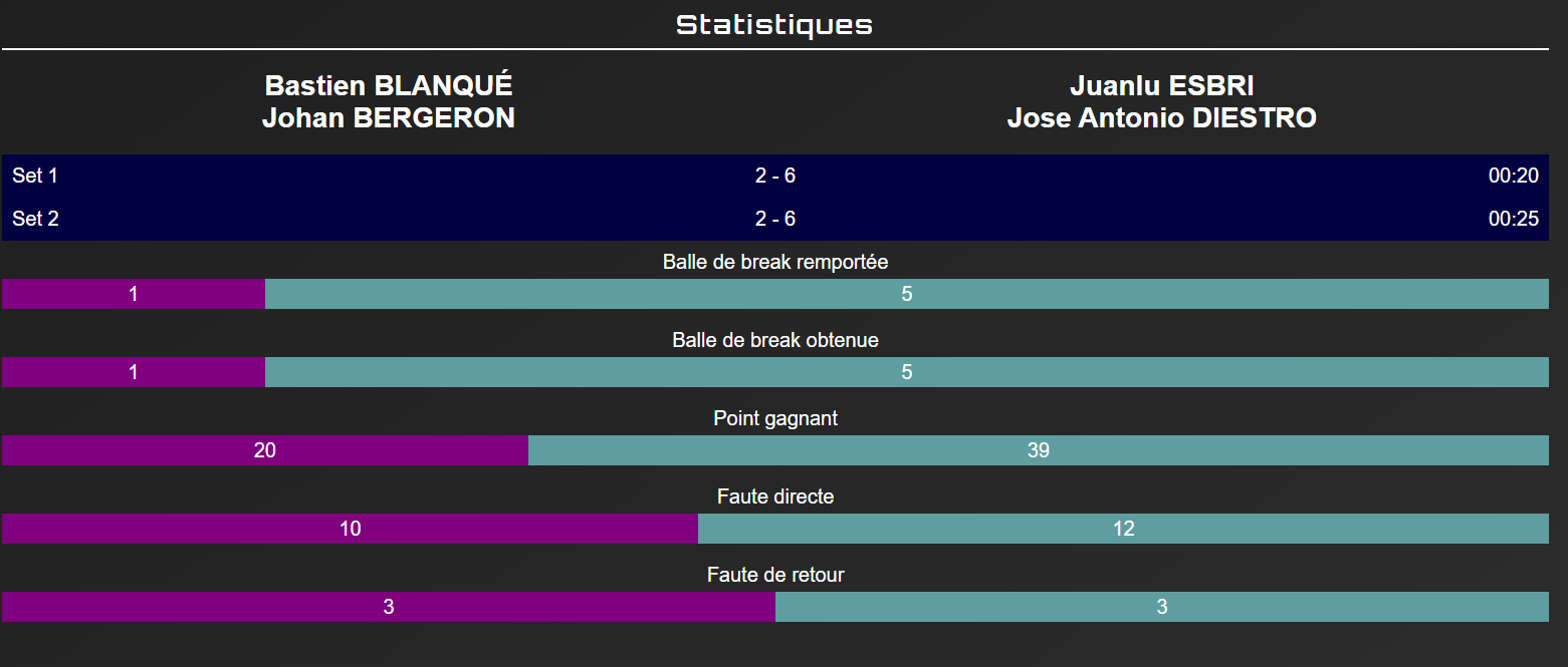 Les estadístiques parlen per si mateixes: 39 punts guanyadors per als espanyols contra 20 per als francesos, 5 pilotes de break convertides sobre 5 per la cap de sèrie 1, i només 1 oportunitat de break per a Blanqué i Bergeron.