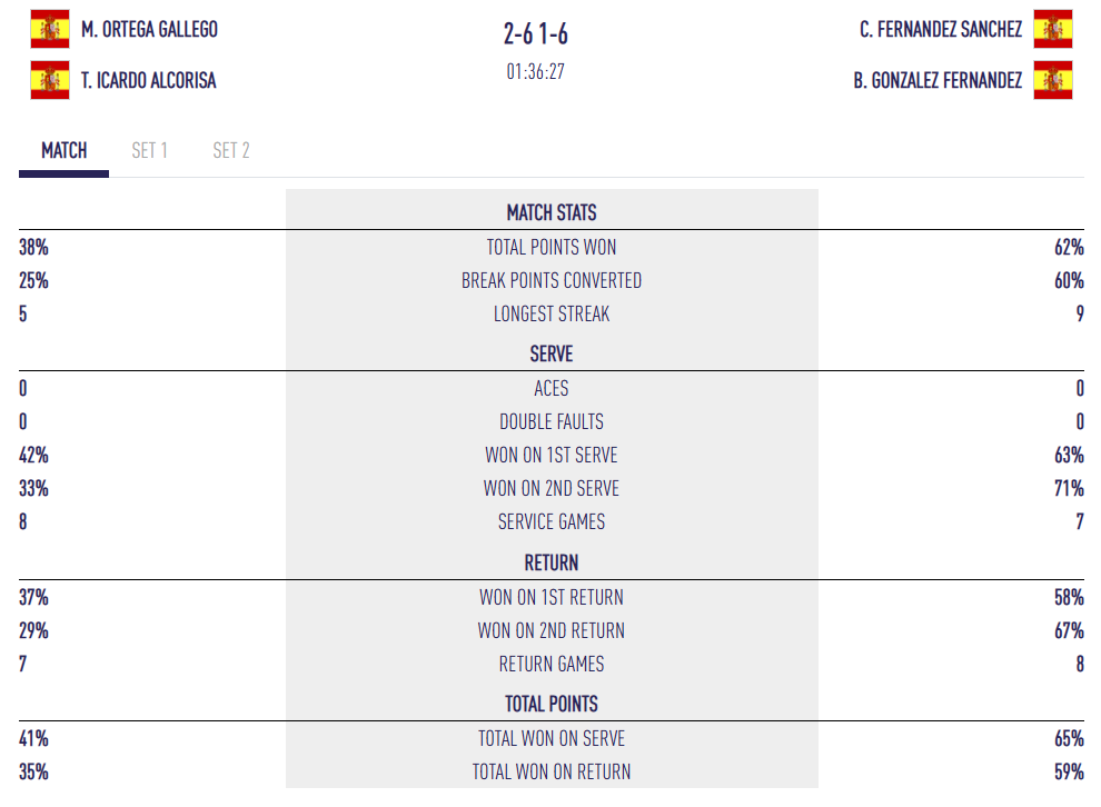 El marcador sec de 6/2 podria fer creure que va ser una formalitat, però aquest primer set va durar 58 minuts. La intensitat era màxima des dels primers intercanvis, en un central escalfat a bloc. En aquesta batalla, González i Fernández van saber marcar la diferència en els moments clau: 3 pilotes de break convertides sobre 6 contra només 1 sobre 4 per als seus rivals.