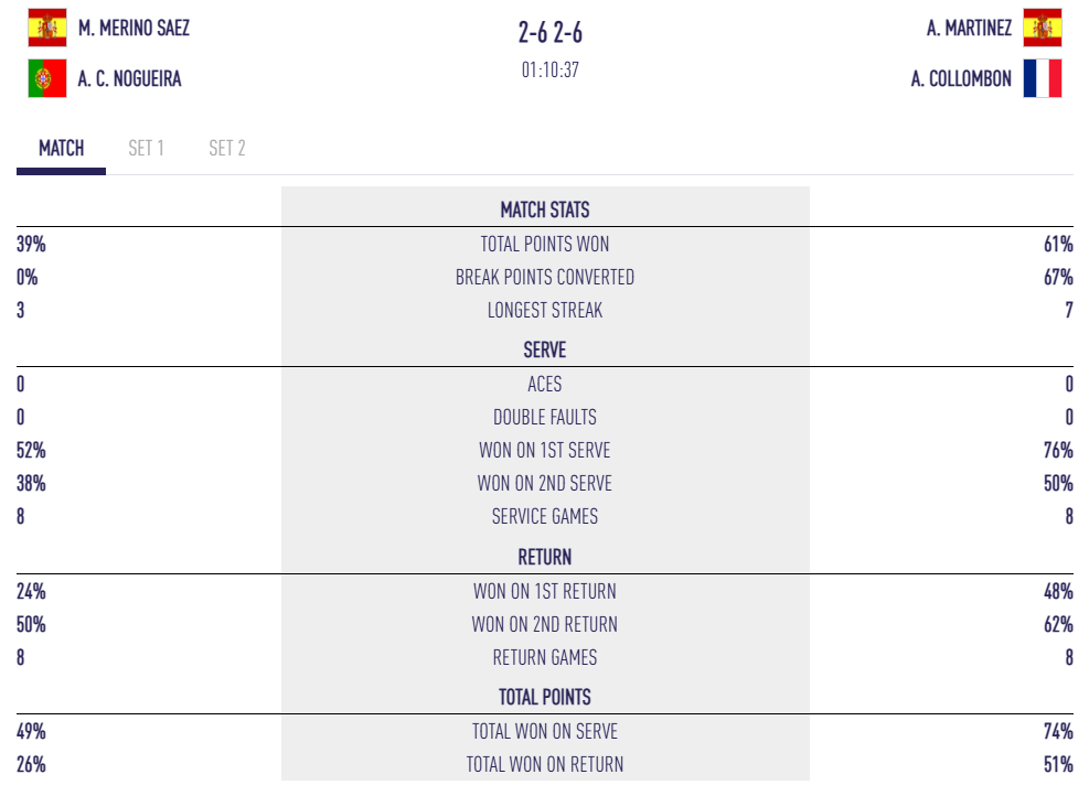 Favorits sobre el paper, Collombon i Martinez havien de gestionar la tornada després de diverses setmanes sense torneig. Missió aconseguida: van agafar el control del partit des de l’inici, aconseguint un break ràpid en cadascun dels sets per establir el seu ritme i pressionar les seves adversàries. Very solides en el servei, van aconseguir ampliar la diferència una segona vegada en cada set, per concloure en 1h10.