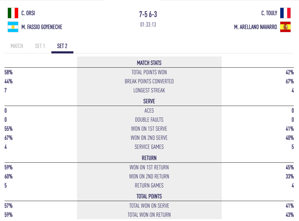 En el segon set, l’Italiana i l’Argentina prenen ràpidament el control. Més sòlides al servei, s’enlairen a 5/2. Touly i Arellano desfan la situació per mantenir l’esperança, però tornen a perdre el seu servei, tancant el partit 6/3.