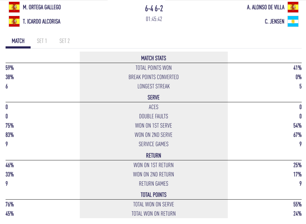 Des de l’inici del partit, Tamara Icardo i Marta Ortega imposen el seu ritme. Sòlides al servei, guanyen els seus jocs de manera autoritària, sovint sense concedir punts. En l’adeu, es procuren nombroses ocasions, amb 5 pilotes de break en aquest primer acte. Si bé els costa concretar, aprofiten l’única pilota de break decisiva a 5/4, per guanyar l’set 6/4 de manera lógica. Al davant, Alonso i Jensen no obtingueren cap oportunitat sobre el servei advers, prova del domini de les seves oposants.