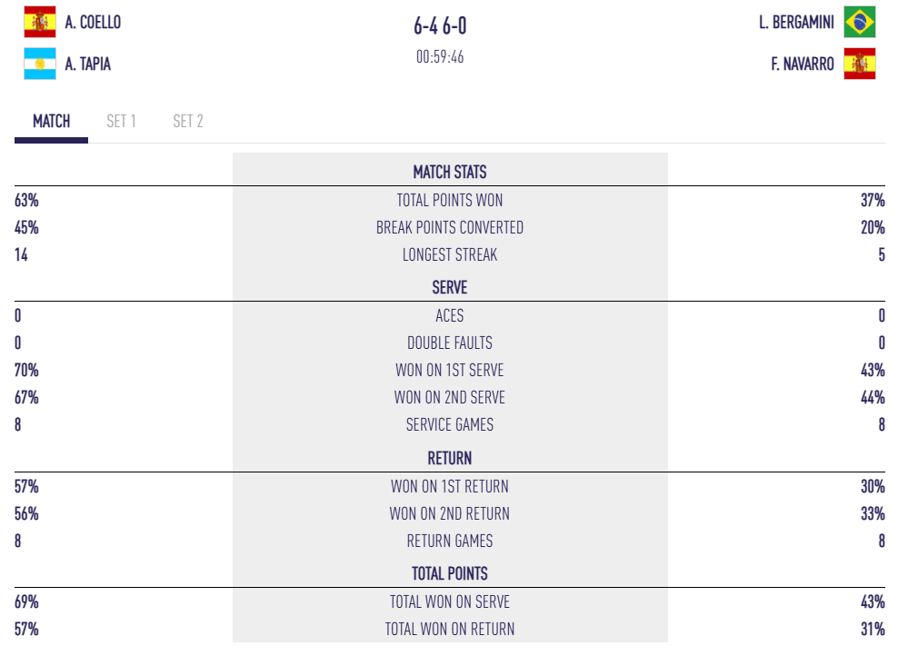 Els outsiders trenquen una vegada, però no dues. La diferència? El realisme i la solidesa dels números 1 mundials, que cometen menys errors directes (7 contra 15). Tapia i Coello mantenen el seu avantatge i tanquen el set 6/4.