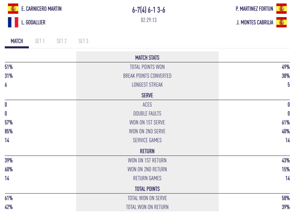 El segon set és d’un sol sentit. Carnicero recupera el seu smash i multiplica els 3 guanyadors, mentre que Godallier imposa un enorme volum de joc. Even cada joc és ajustat, la parella franco-espanyola domina i tanca el set 6/1.