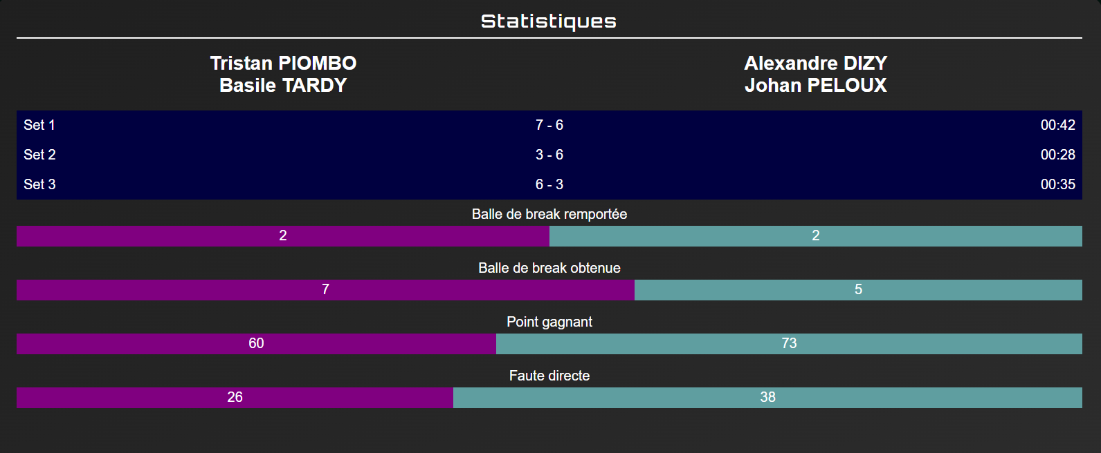 Enfront d’Alexandre Dizy i Johan Peloux (TS4), la batalla ha estat llarga i física. El primer set és ajustat: Peloux serveix per al set a 6/5, però Piombo i Tardy tornen a temps i arranquen el tie-break. Tristan Piombo es mostra decisiu i permet al seu duo passar davant: 7/6.