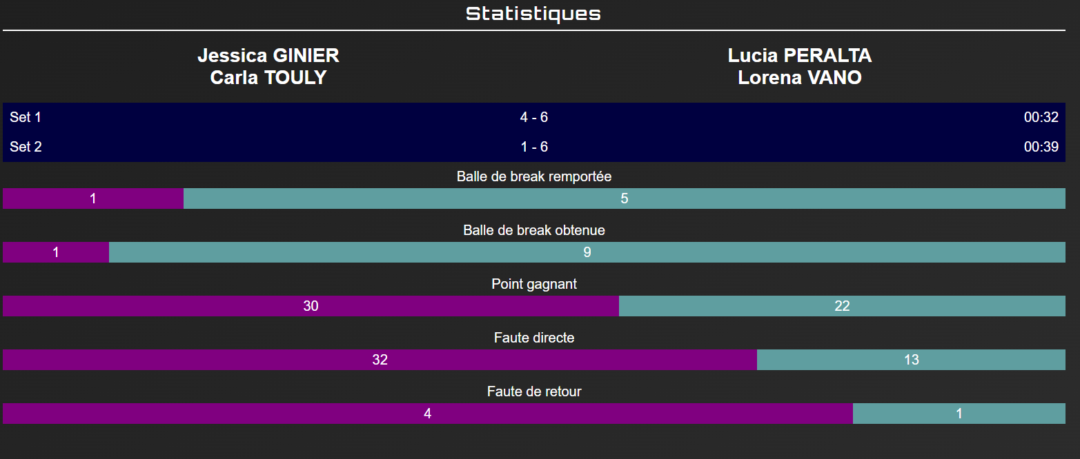 Resultat: 32 faltes directes per les franceses, contra només 13 per les seves adversàries. Malgrat 30 punts guanyadors, Ginier i Touly no han aconseguit canviar la tendència, caient de manera lògica 6/1 en el segon set.