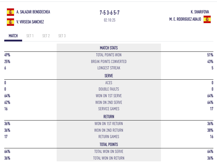 Les dues espanyoles han sortit vencedores d’un combat de 2h15, en vèncer la parella Salazar (11a mundial) / Virseda (10a mundial), en tres sets: 5/7 6/3 7/5.