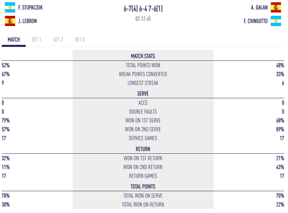 Ha calGut un tie-break decisiu al tercer set per desempatar aquestes dues parelles. Franco Stupaczuk i Juan Lebrón signen una victòria referent davant Alejandro Galán i Federico Chingotto: 6/7 6/4 7/6. Un partit tens, espectacular i elèctric que permet a Stupa i Lebrón arribar a la final del Valladolid P2, amb un extra d’una primera victòria per a Lebrón davant el seu antic company Galán des de la seva separació.