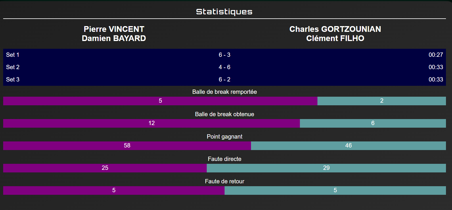 Pero en el set decisiu, Vincent i Bayard recuperen el seu tempo. En dirigint-se a Clément Filho i pujant ràpidament a la xarxa, provoquen lobs defensius que Pierre i Damien acaben sense pietat. El joc més directe i afilat els permet trencar ràpidament, i després segellar la victòria amb un segon trencament a 5/2. Marcador final: 6/3 4/6 6/2.
